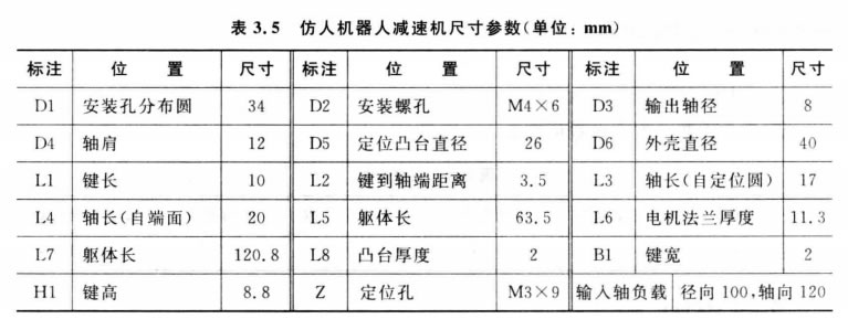 (2)直流伺服電機選型。根據(jù)上面的分析,為本節(jié)設(shè)計的智能交互機器人選用了兩種 類型的直流伺服電機,分別是上海瑞克科技發(fā)展有限公司的50SYXB-01 和 5 0SYXB- 02,質(zhì)量大約為0.5~1.0kg, 規(guī)格如表3.3所示。從表中不難看出這種直流伺服電機 轉(zhuǎn)速非常高,Z高可達到3000r/min(轉(zhuǎn)/分鐘);而其轉(zhuǎn)矩又很小,不能直接用于關(guān)節(jié)驅(qū) 動裝置。
