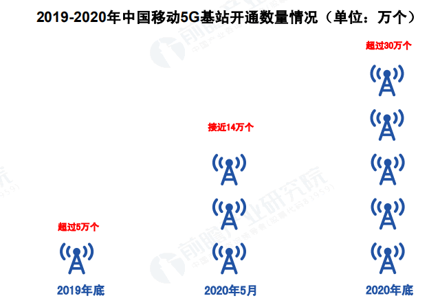 在2020年6月6日,工信部新聞宣傳中心舉行的“5G發(fā)牌一周年”線上峰會(huì)上,中國(guó)移動(dòng)表示目前已開(kāi)通近14萬(wàn)個(gè)5G基站,并將加快網(wǎng)絡(luò)建設(shè),確保年內(nèi)累計(jì)建成30萬(wàn)個(gè)5G基站,實(shí)現(xiàn)在全國(guó)所有地級(jí)以上城市提供5G商用服務(wù),夯實(shí)經(jīng)濟(jì)社會(huì)數(shù)字化轉(zhuǎn)型的網(wǎng)絡(luò)基礎(chǔ)。