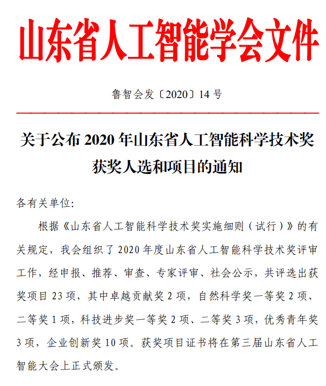 根據(jù)《山東省人工智能科學(xué)技術(shù)獎(jiǎng)實(shí)施細(xì)則(試行)》的有關(guān)規(guī)定,我會(huì)組織了2020年度山東省人工智能科學(xué)技術(shù)獎(jiǎng)評(píng)審工作,經(jīng)申報(bào)、推薦、審查、專(zhuān)家評(píng)審、社會(huì)公示,共評(píng)選出獲獎(jiǎng)項(xiàng)目23項(xiàng),其中出色貢獻(xiàn)獎(jiǎng)2項(xiàng),自然科學(xué)獎(jiǎng)一等獎(jiǎng)2項(xiàng)、二等獎(jiǎng)1項(xiàng),科技進(jìn)步獎(jiǎng)一等獎(jiǎng)2項(xiàng)、二等獎(jiǎng)3項(xiàng),優(yōu)秀青年獎(jiǎng)3項(xiàng),企業(yè)創(chuàng)新獎(jiǎng)10項(xiàng)。獲獎(jiǎng)項(xiàng)目證書(shū)將在第三屆山東省人工智能大會(huì)上正式頒發(fā)。