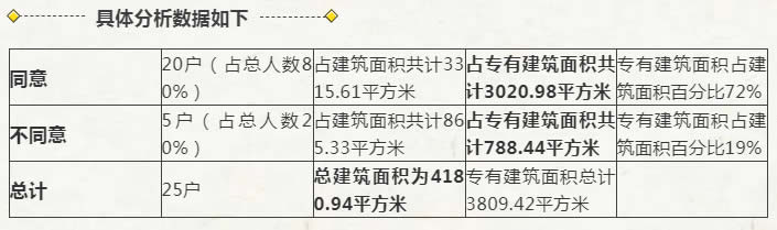 2016年1月10日,湛江市霞山區某小區就召開了業主大會,并作出決議,確認該小區業主共有66戶,其中同意加裝小區電梯的業主數為52戶(東門總共25戶,其中20戶同意加裝;中門總共17戶,其中9戶同意加裝;西門總共24戶,其中23戶同意加裝),該小區業主大會會議決定:在該小區東門、西門各加裝一臺電梯。2016年11月18日,根據該小區的申請,湛江規劃局依法頒布了在該小區東門、西門各加裝一臺電梯的《建設工程規劃許可證》。小區西門的電梯安裝較為順利,但東門不同意安裝的5位業主對在東門安裝電梯的工程實施中百般阻撓,將車輛停放在施工現場以阻礙施工。經派出所、社區法律顧問等多方調解無效后,2017年9月11日,東門同意安裝的李康林等20人將不同意安裝的戴戈等5人訴上法庭,要求被告移走障礙物,不得阻止電梯安裝。 經法院查明,涉及本案的業主共有25戶,分為三種戶型,E號戶型的建筑面積為182.78平方米、專有建筑面積為166.54平方米,F號戶型的建筑面積為144.48平方米、專有建筑面積為131.64平方米,G號戶型的建筑面積為172.51平方米、專有建筑面積為157.18平方米。同意加裝電梯的戶主有20戶,其中E號戶型有6戶,F號戶型有7戶,G號戶型有7戶,占建筑面積共計3315.61平方米,占專有建筑面積共計3020.98平方米。不同意加裝電梯的戶主有5戶,其中E號戶型有3戶,F號戶型有1戶,G號戶型有1戶,占建筑面積共計865.33平方米,占專有建筑面積共計788.44平方米。涉案樓房東門業主的總建筑面積為4180.94平方米。