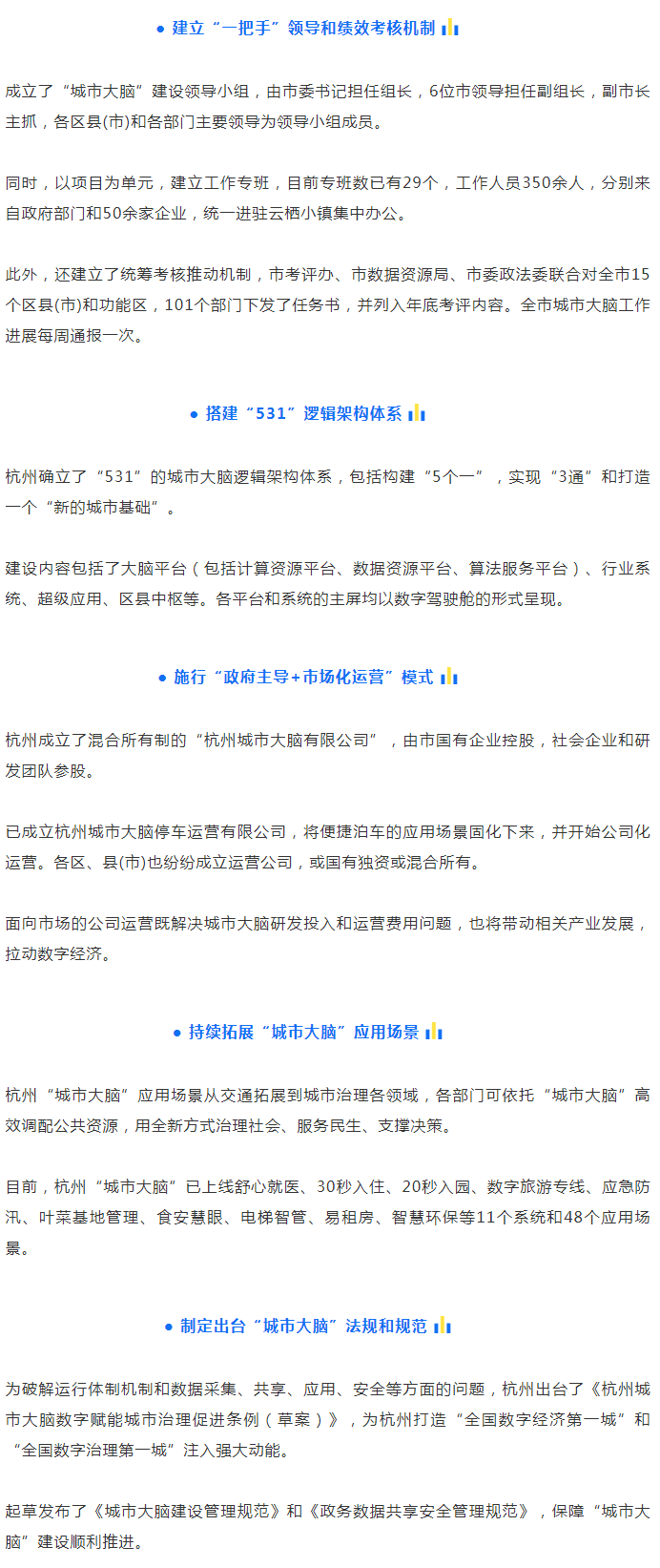 治堵取得階段性勝利后,2018年9月和12月,杭州市推出了“城市大腦升級”版,提出構建 “以大腦中樞平臺為核心,縱向到區縣(市),橫向到各部門”的“城市大腦”,建立了市級、部門系統、區縣平臺和街道平臺四類數字駕駛艙,并聚焦城市治理的“痛點”“堵點”和群眾反映強烈的“熱點”“難點”問題,推出了11大系統和48個應用場景,“城市大腦”在城市運行的生命體征感知、公共資源配置、宏觀決策指揮、事件預測預警、“城市病”治理等方面發揮了重要作用。