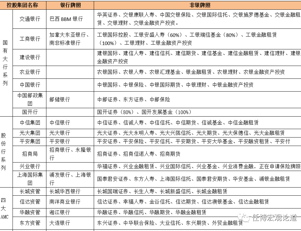 我們統(tǒng)計(jì)了77家金融控股集團(tuán)牌照擁有情況。整體來看,可以將我國的金融控股集團(tuán)分為四大類,分別為金融體系下的金控集團(tuán)17家、大型央企背景下的金控集團(tuán)7家、地方國企背景下的金控集團(tuán)17家以及其它系列36家。