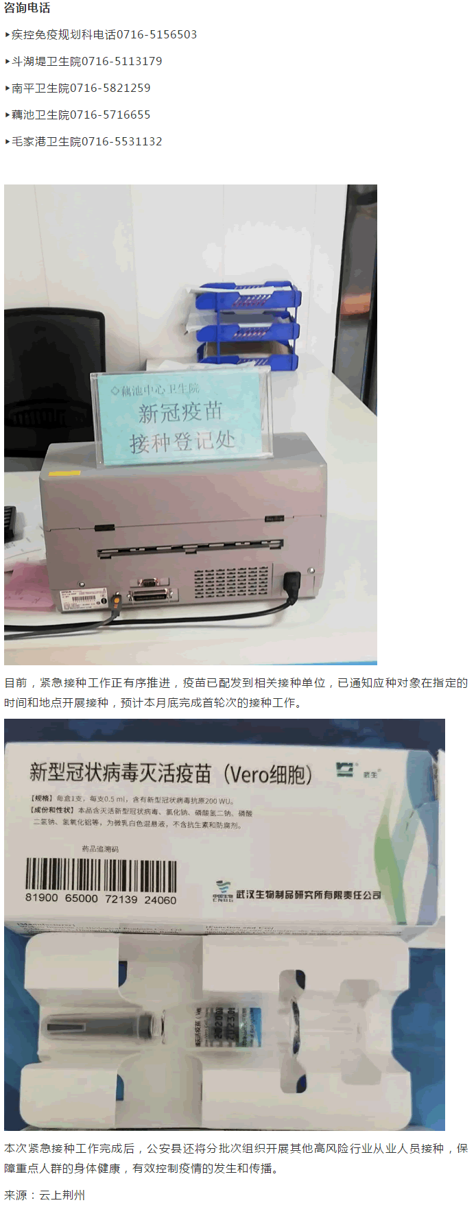 為使接種工作安全有序,公安縣確定了4家醫(yī)院承擔(dān)全縣新G疫苗緊急接種工作,優(yōu)先為冷鏈相關(guān)行業(yè)從業(yè)人員免費(fèi)接種新G疫苗,同時指定了縣人民醫(yī)院為新G疫苗緊急接種異常反應(yīng)定點(diǎn)處理醫(yī)院。
