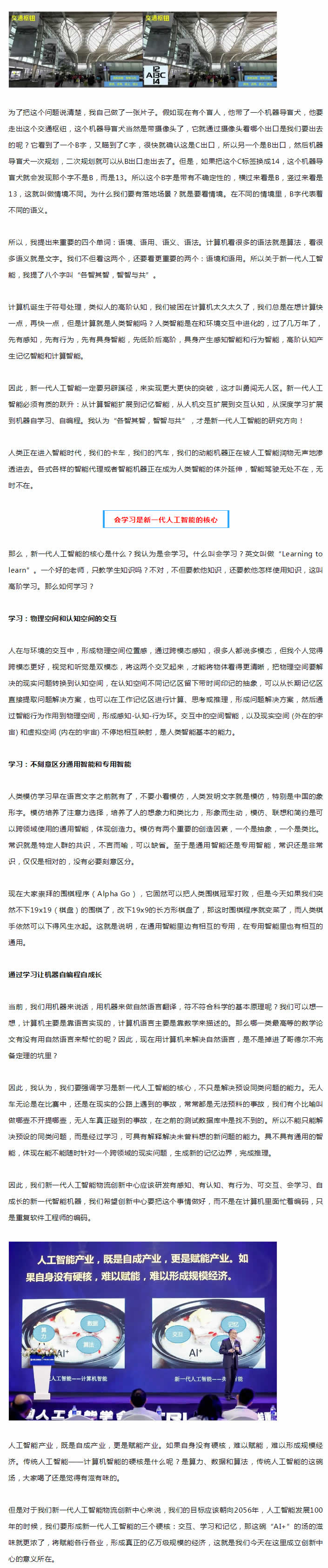 新一代人工智能一定要另辟蹊徑,來實現(xiàn)更大更快的突破,這才叫勇闖無人區(qū)。新一代人工智能需要有質的躍升:從計算智能擴展到記憶智能,從人機交互擴展到交互認知,從深度學習擴展到機器自學習、自編程。我認為“各智其智,智智與共”,才是新一代人工智能的研究方向!