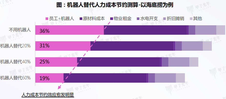 3 按每臺機器人替代2-3名傳菜員來看,餐飲機器人的應用可將海底撈的員工成本占比由36%減低到31%